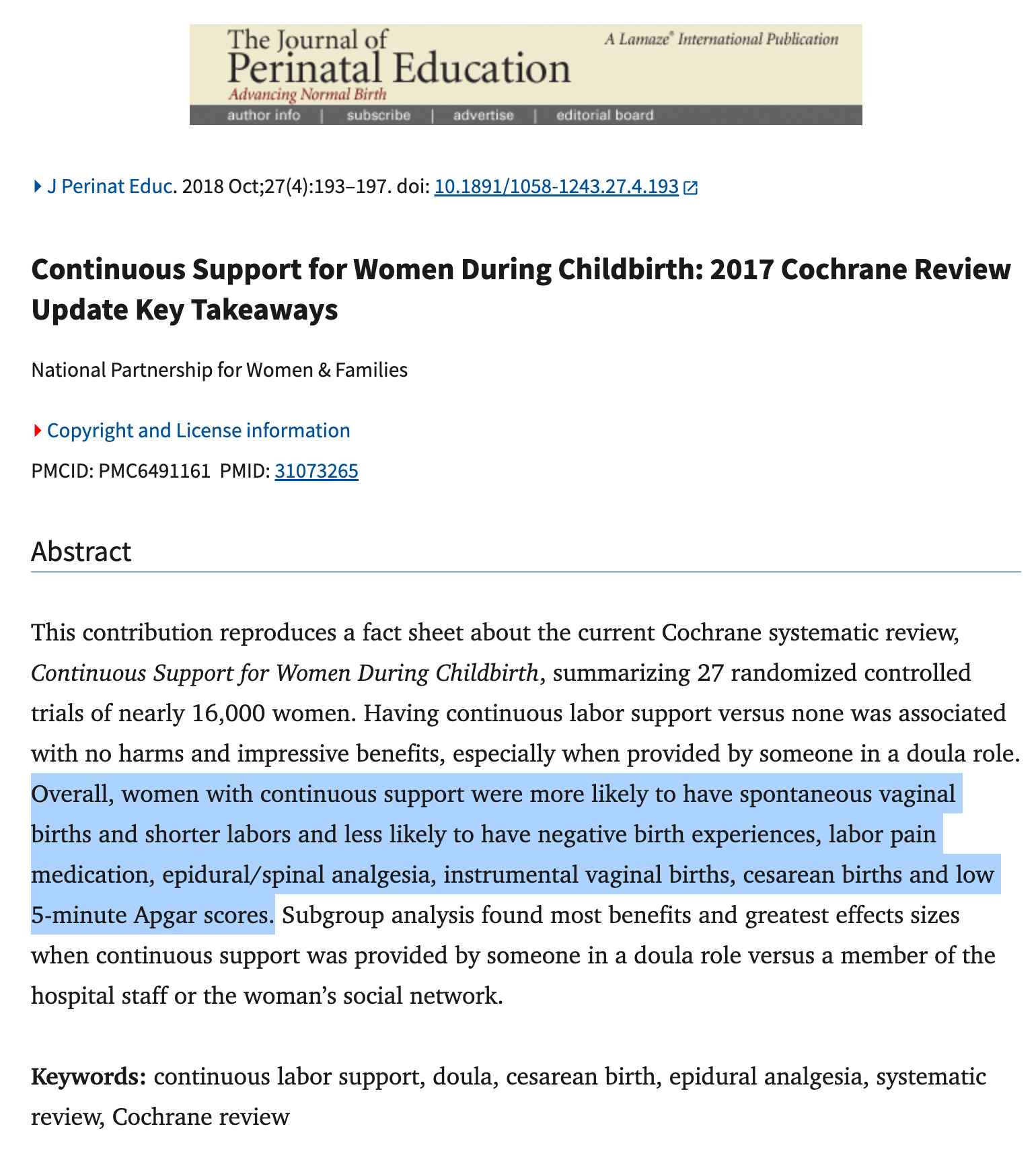 Bohren, M. A., Hofmeyr, G. J., Sakala, C., Fukuzawa, R. K., & Cuthbert, A. (2017). Continuous support for women during childbirth. Cochrane Database of Systematic Reviews, 2017(7), Article CD003766. https://doi.org/10.1002/14651858.CD003766.pub6 pretermbirthca.ucsf.edu+3Cochrane Library+3Cochrane Library+3